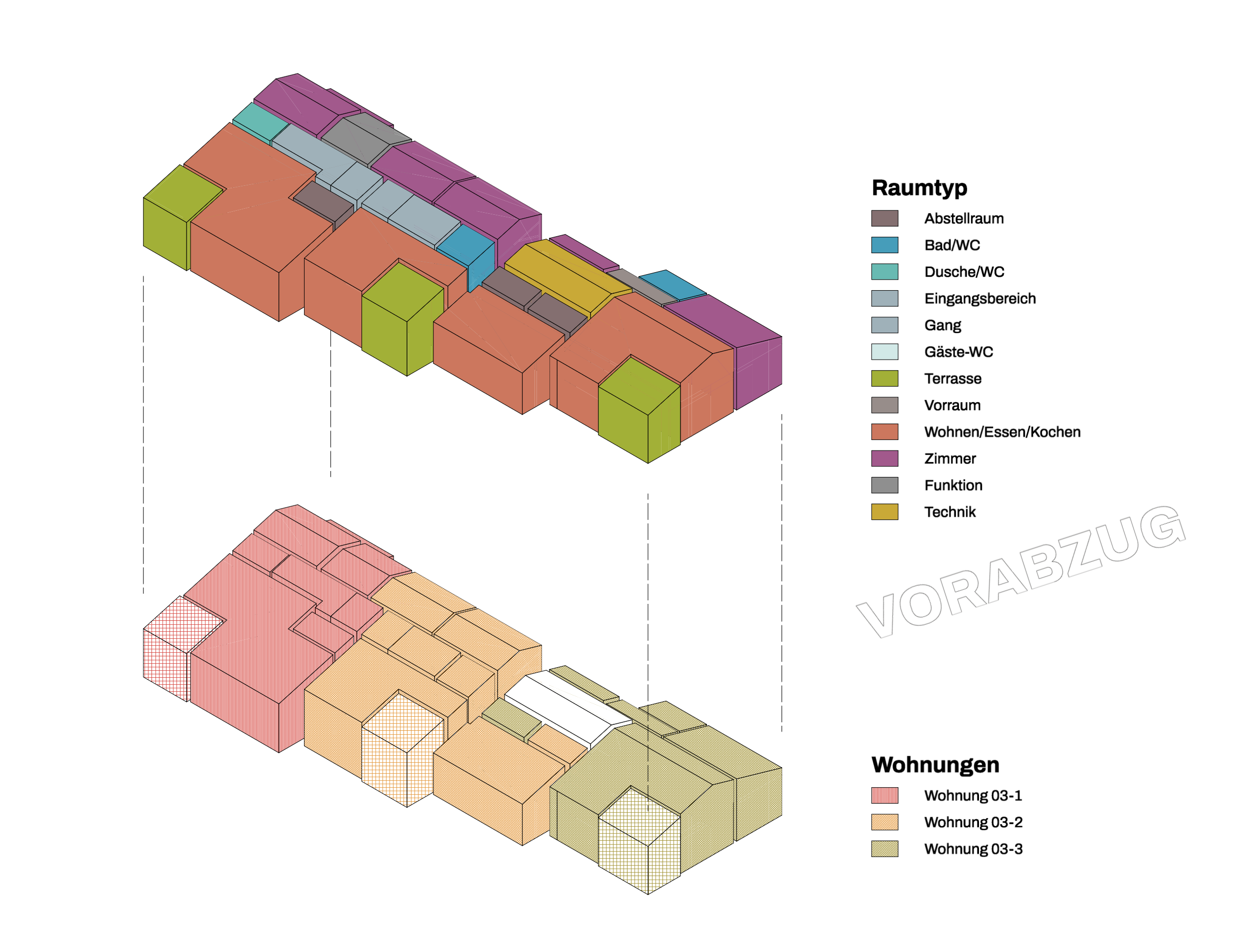 Projet d'axonométrie montrant l'agencement par pièce et par appartement